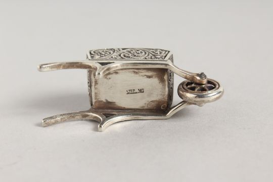 A SILVER WHEELBARROW PIN CUSHION.
