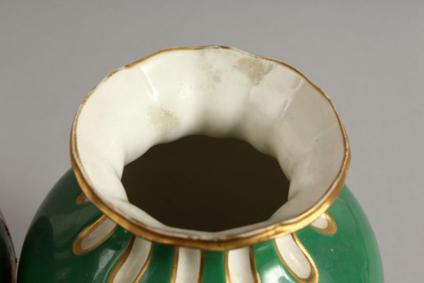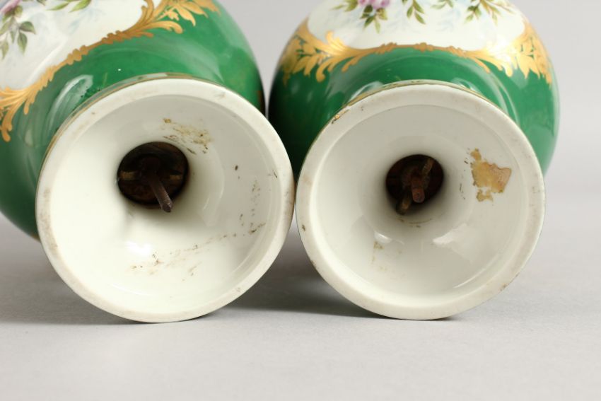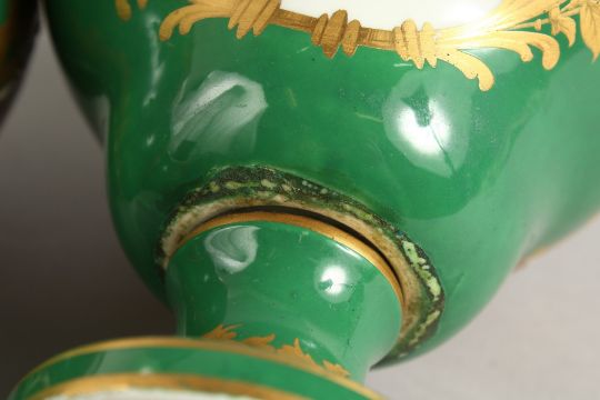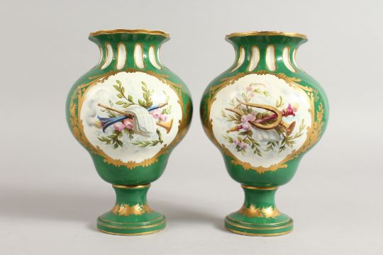 A PAIR OF FINE MID 19TH CENTURY COALPORT VASES in Sevres style, painted with Wattuesque of young lovers or musical instruments with jewelled panels on a green ground.