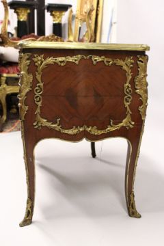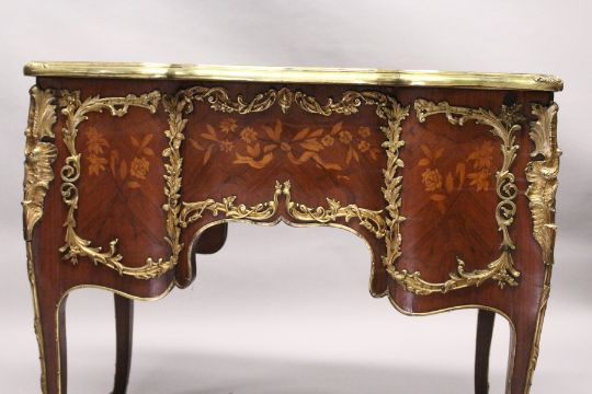 A SUPERB LOUIS XVI DESIGN KINGWOOD AND MARQUETRY COMMODE, the top with leather writing panel, five drawers to the front with ormolu handles and mounts.