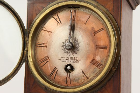 A GOOD MINIATURE MAHOGANY LONGCASE CLOCK by AITCHISON & CO., LONDON and LEEDS, the case with fan inlay and lines.