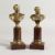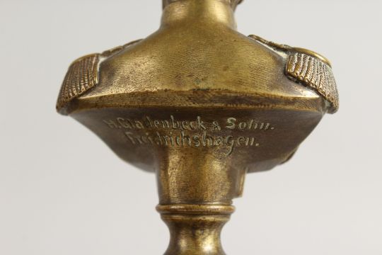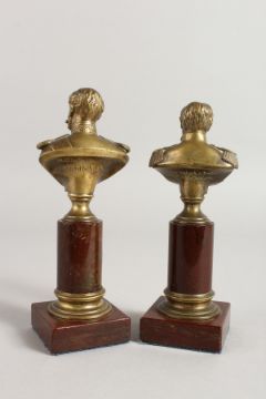 A SMALL PAIR OF BRONZE BUSTS on marble columns. Signed.