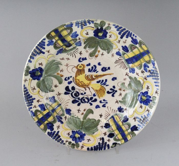 AN EARLY SPANISH FAIENCE DISH in mainly blue and yellow.