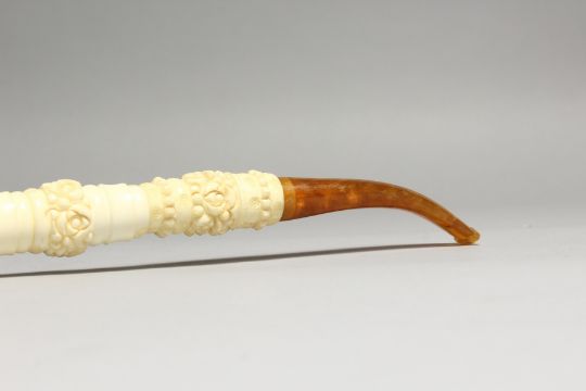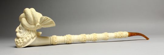 A LARGE CARVED MEERSCHAUM PIPE, head of a man, in a leather case.