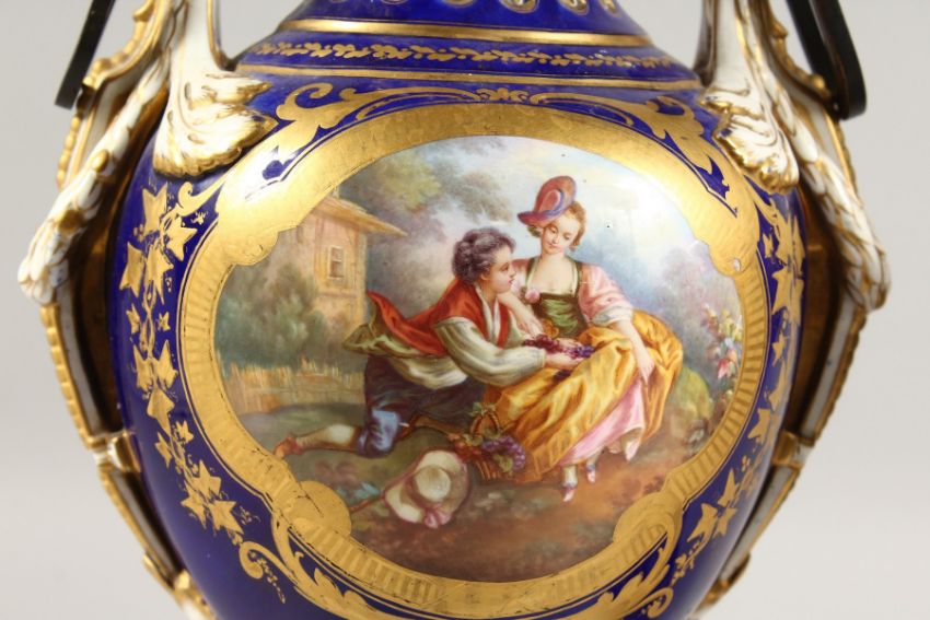 A SUPERB PAIR OF SEVRES TWO-HANDLED VASES AND COVERS, the rich blue ground decorated with gilt and painted with reverse panels of young lovers and musical trophies.