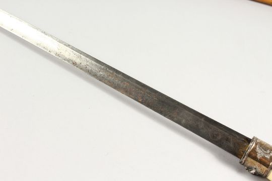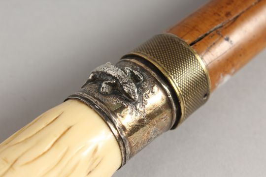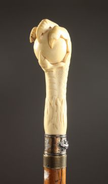 A 19TH CENTURY IVORY CLAW AND BALL SWORD STICK, the silver band with lizards.