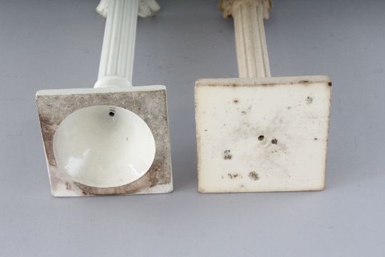 TWO CREAMWARE CORINTHIAN COLUMN CANDLESTICKS.