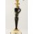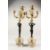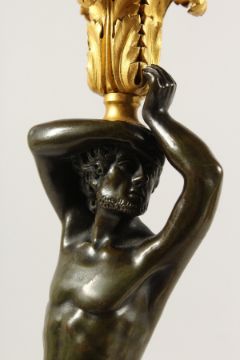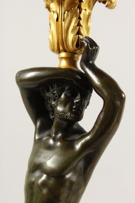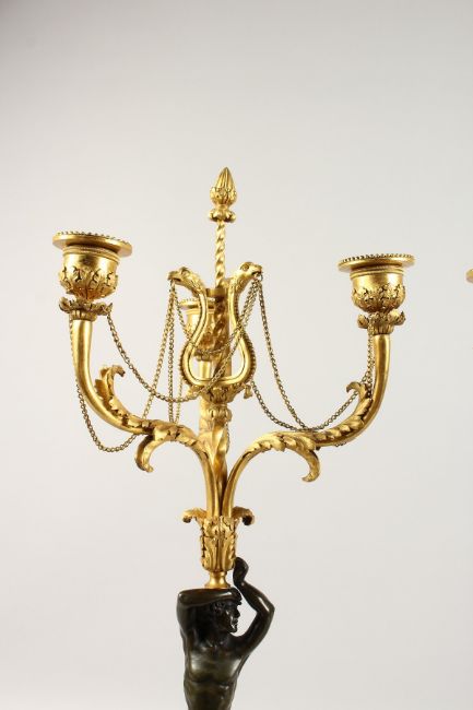 A SUPERB PAIR OF REGENCY BRONZE, ORMOLU AND MARBLE CANDELABRA, formed as bronze figures holding three scrolling ormolu sconces with chains, on a circular marble base.