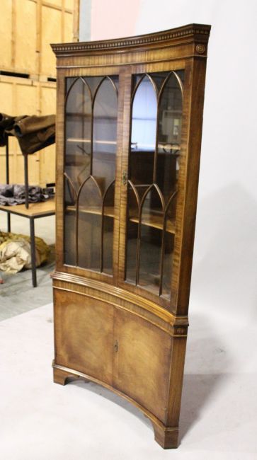 A GEORGIAN-STYLE MAHOGANY CONCAVE STANDING BOOKCASE, the top with double glazed doors over a base with double panel doors on bracket feet.