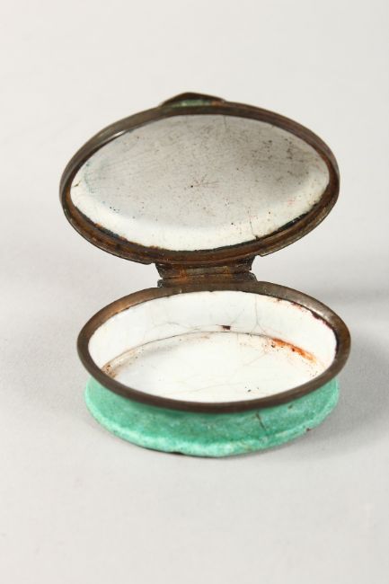 A BATTERSEA ENAMEL SNUFF BOX, the lid with a bird.
