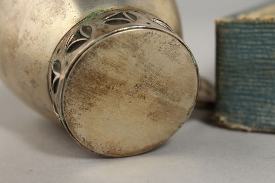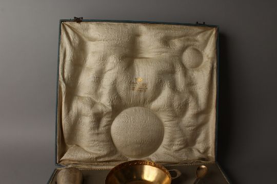 A CZECH .800 SILVER BREAKFAST SET by ED. RIEMER, PRAG, GRABEN 33, CIRCA. 1920-1930, in a fitted case, comprising two-handled bowl, beaker, cup and saucer, egg cup, serviette ring, salt and pepper, teaspoon and two mustard spoons.
