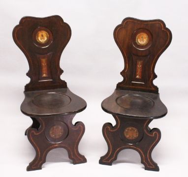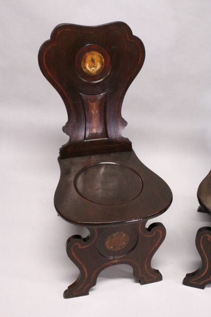 A VERY GOOD PAIR OF REGENCY MAHOGANY HALL CHAIRS, the shaped backs with painted crest on solid seats.