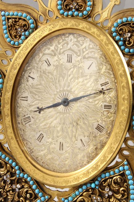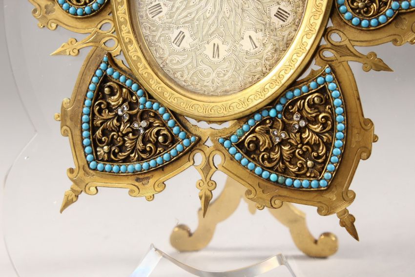 A SUPERB STRUTT CLOCK, on a shaped crystal frame, the oval dial with fine engraving, surrounded by seven various shapes with turquoise and diamond chips.
