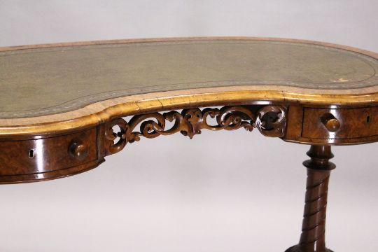 A VICTORIAN WALNUT KIDNEY SHAPED WRITING DESK, with inset green leather top, two small bowfronted drawers, pierced fretwork apron, on turned legs with brass castors and uniting stretcher.