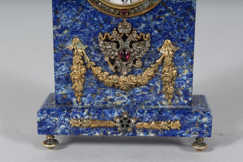 A SUPERB RUSSIAN FABERGE STYLE LAPIS AND SILVER CLOCK, with applied decoration, winged eagles and garlands.