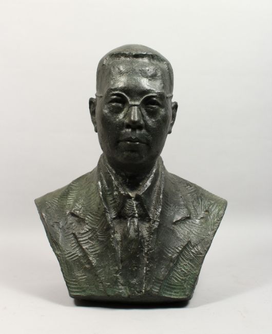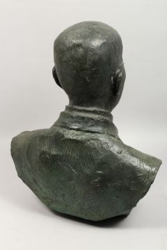 A LARGE BRONZE BUST OF A MAN, wearing spectacles.