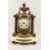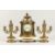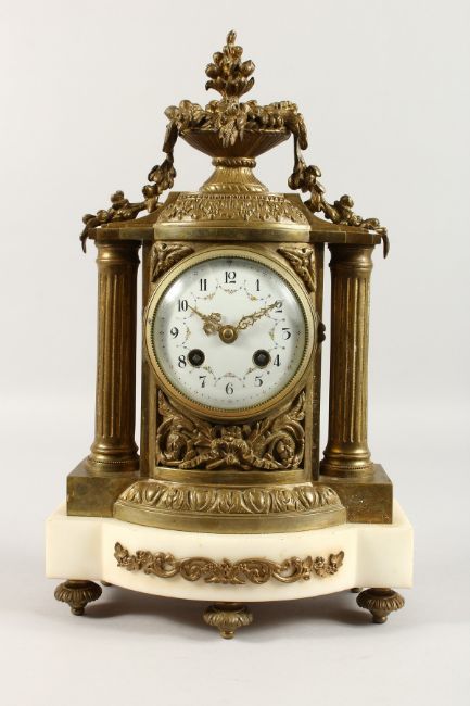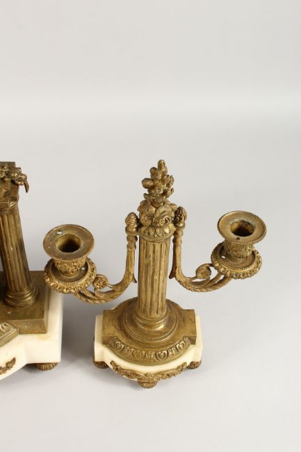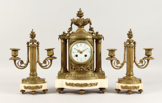 A GOOD LOUIS XVI DESIGN ORMOLU AND MARBLE THREE PIECE CLOCK GARNITURE, striking on a single bell, the clock with column sides and urn finial, 14.5ins high, complete with a pair of two branch side pieces, 10ins high.