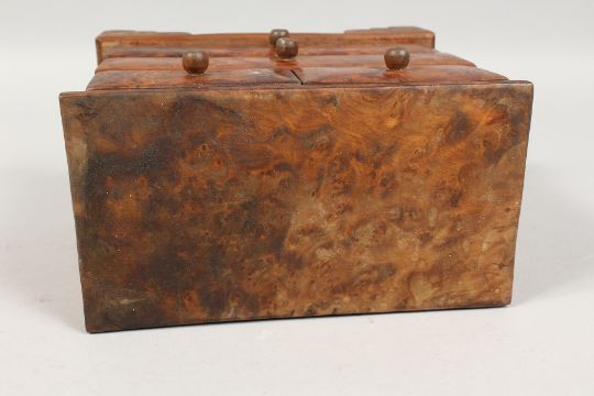 A SMALL MINIATURE THUYA WOOD FOUR DRAWER CHEST on bracket feet.