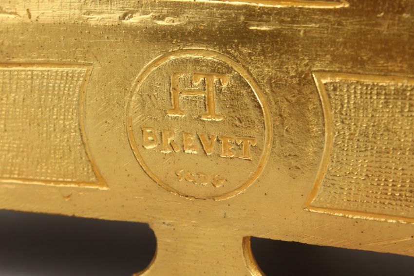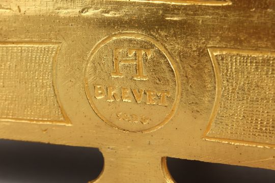 A GOOD LOUIS XVI DESIGN GILT METAL AND PORCELAIN CLOCK, stamped H.T. BREVET, 10 PH MOUREY 62, with floral urn finial and rich painted Sevres panels and dial.