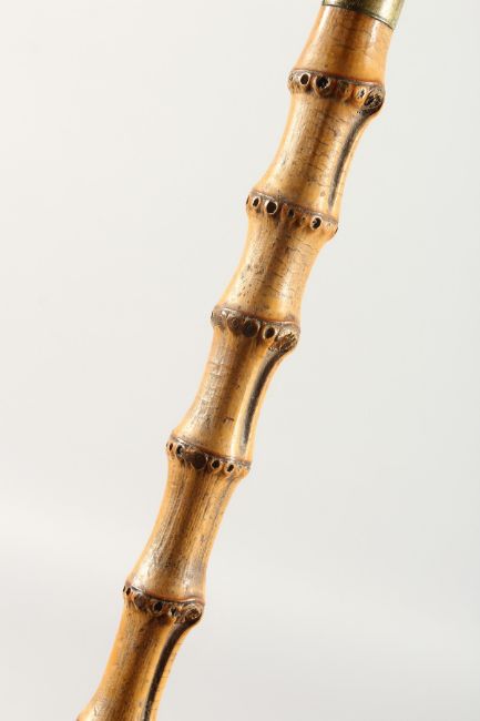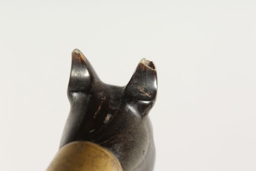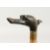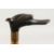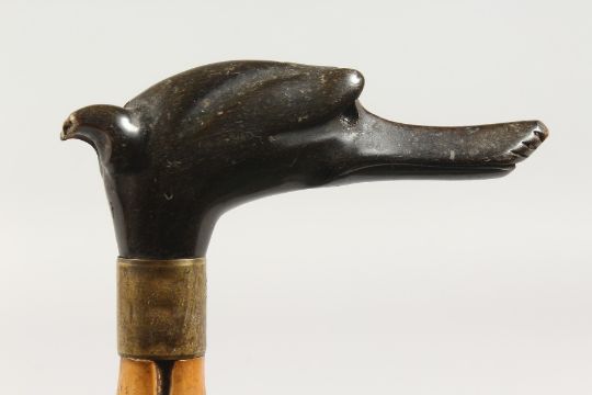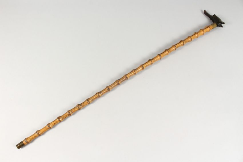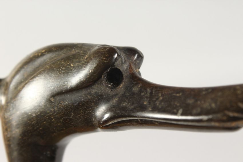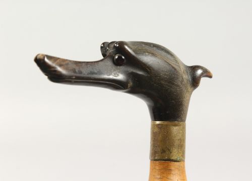 A 19TH CENTURY RHINO CARVED GREYHOUNDS HEAD WALKING STICK.