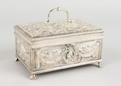 A DUTCH SILVER RECTANGULAR CASKET, chased and engraved in the Louis XII style, the top with handle, on four claw feet.