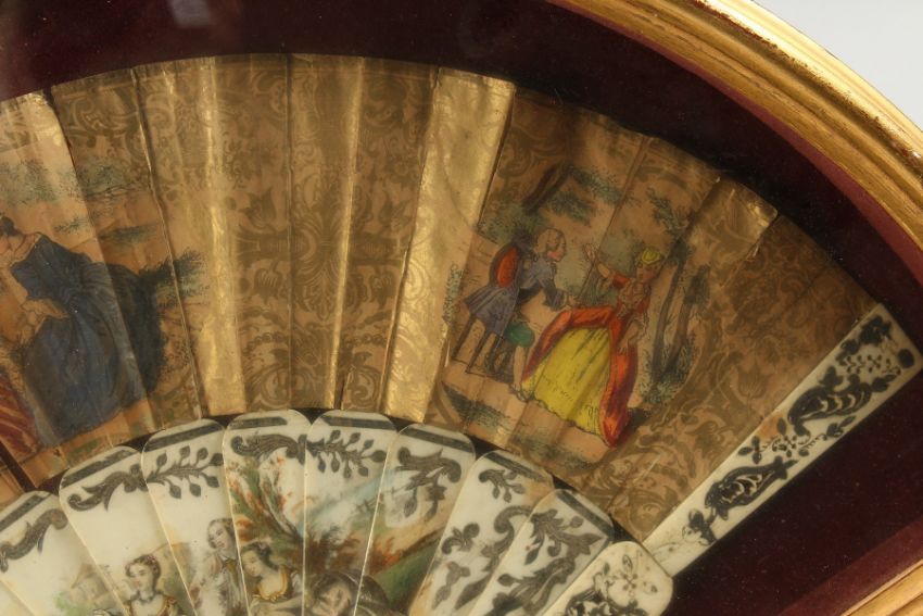A GOOD 18TH CENTURY FRENCH IVORY AND PAPER FAN in a glass case, printed with figures.