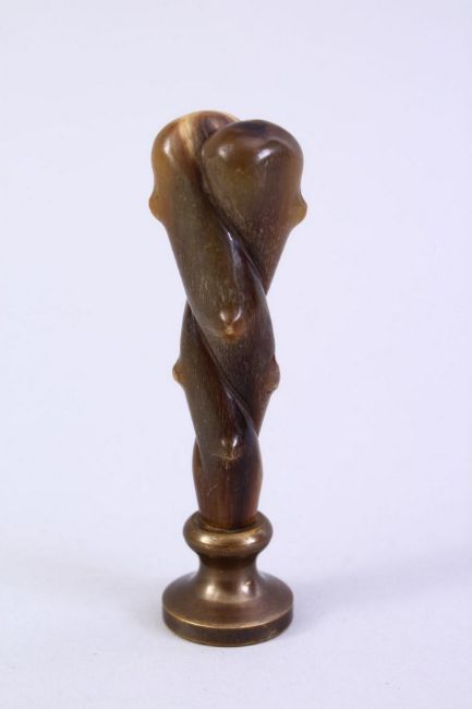 A GOOD 19TH CENTURY CHINESE CARVED RHINO HORN HANDLE SEAL, carved in the form of natural subject, with a carved seal section, 9.5cm.