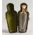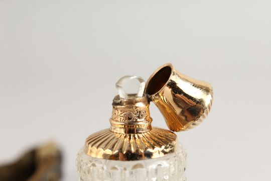 A CUT GLASS SCENT BOTTLE with gold top, in a fitted case.