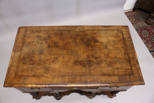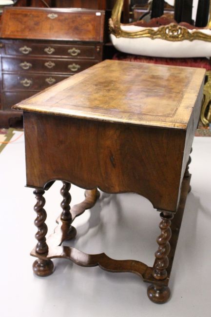 AN 18TH CENTURY WALNUT RECTANGULAR TOP SIDE TABLE, with quartered crossbanded top, three frieze drawers with brass handles, barley twist legs and shaped uniting stretchers.