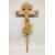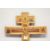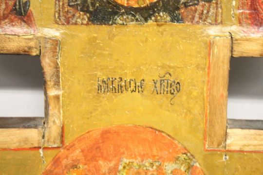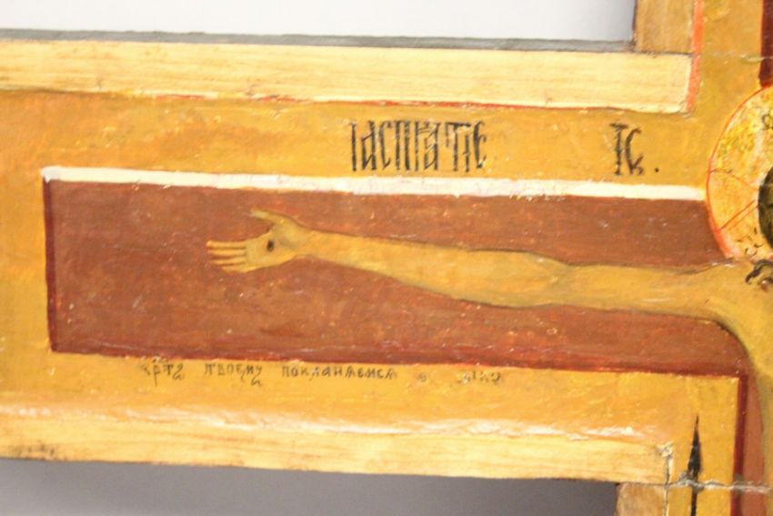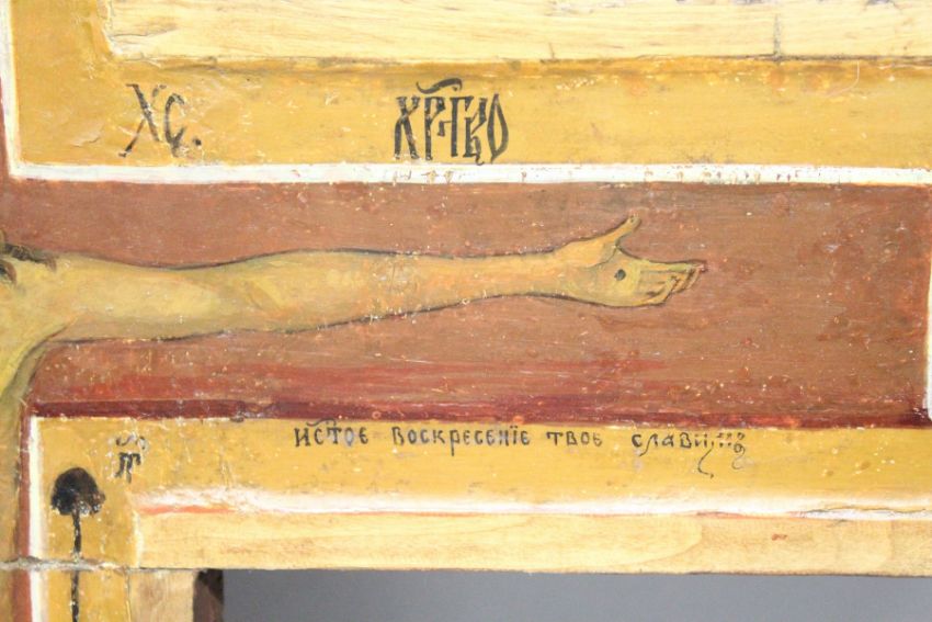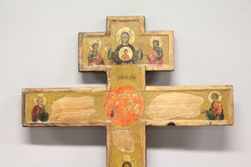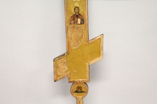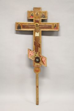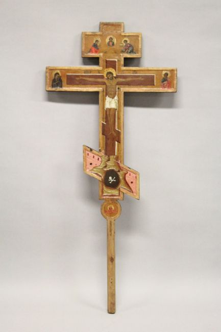 A LARGE 18th / 19th CENTURY RUSSIAN ORTHODOX PAINTED WOODEN DOUBLE SIDED THREE BAR CROSS.