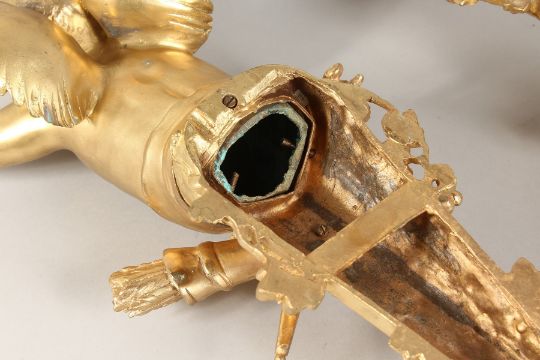 A VERY GOOD PAIR OF GILT BRONZE CHERUB WALL LIGHTS, each with two arms.