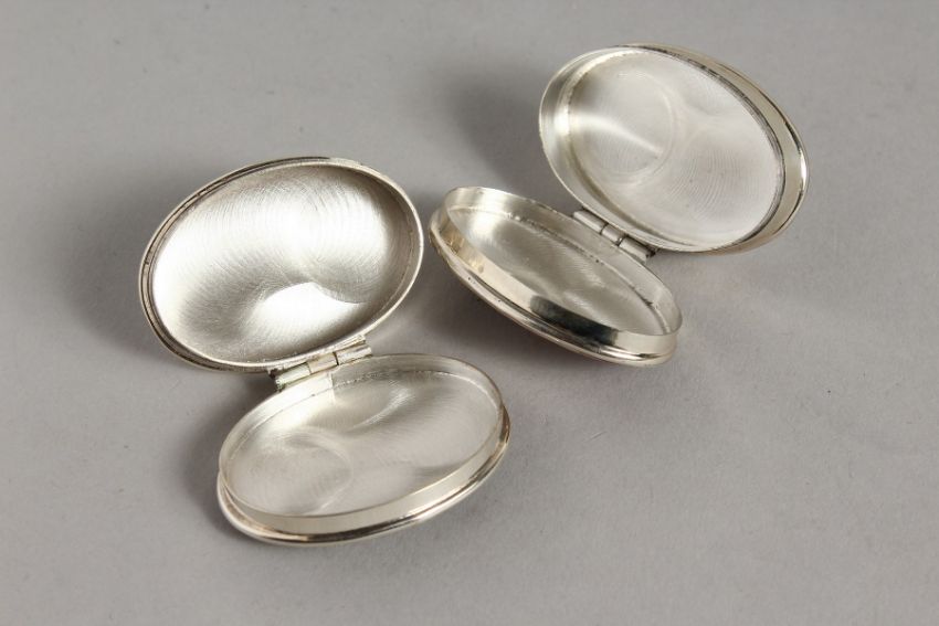 TWO EROTIC SILVER ENAMEL TOP PILL BOXES.