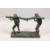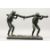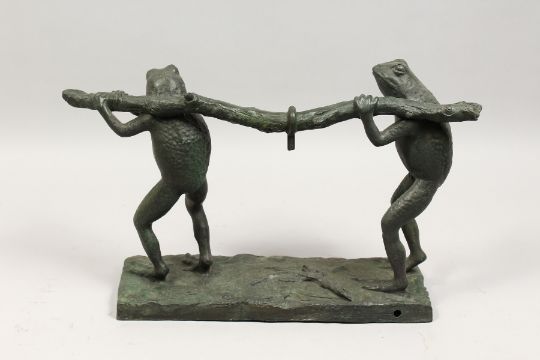 AN AMUSING CAST BRONZE GROUP OF TWO FROGS CARRYING A TREE BRANCH.