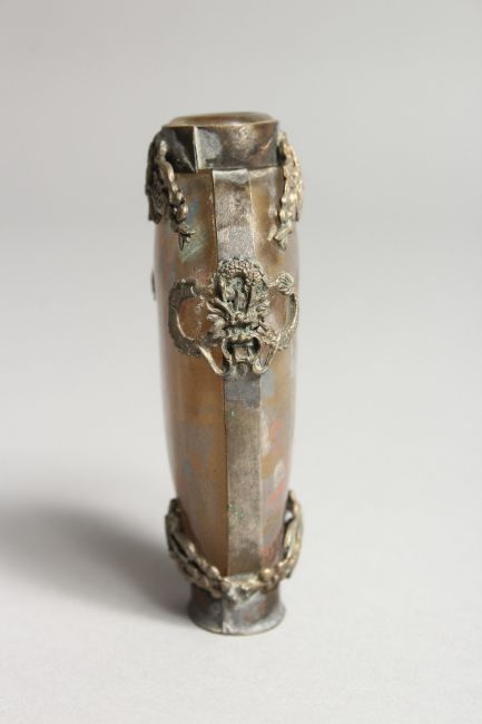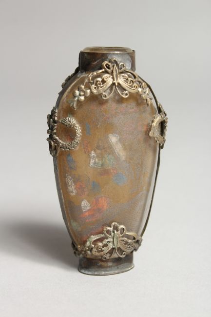 A REVERSE-PAINTED SNUFF BOTTLE with filigree butterfly and dragon mounts. 7cm high.