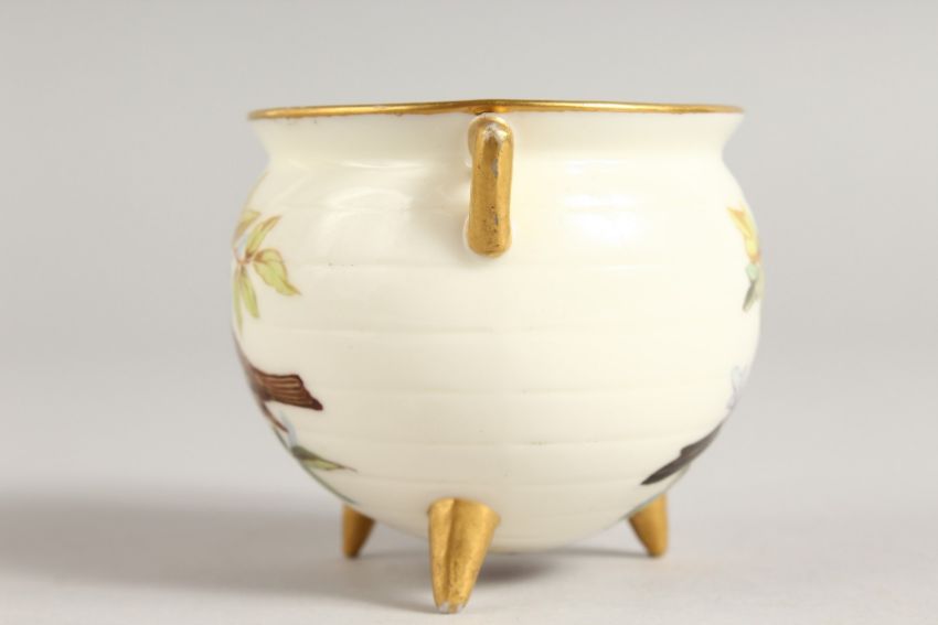 A ROYAL WORCESTER CAULDRON ON THREE PEG FEET painted with two birds by John Hopewell, date code for 1896.
