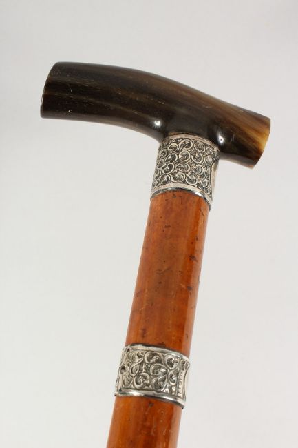 A STRONG EDWARD VII RHINO HANDLED WALKING STICK with two silver bands.
