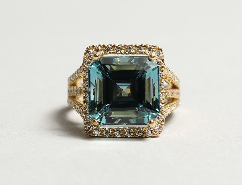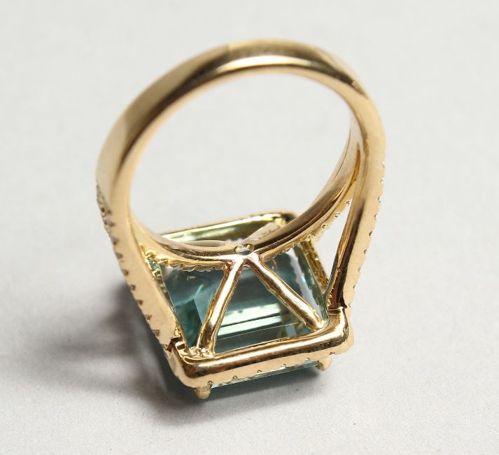 A SUPERB 18CT YELLOW GOLD, AQUAMARINE AND DIAMOND RING.