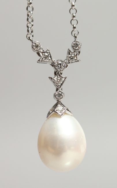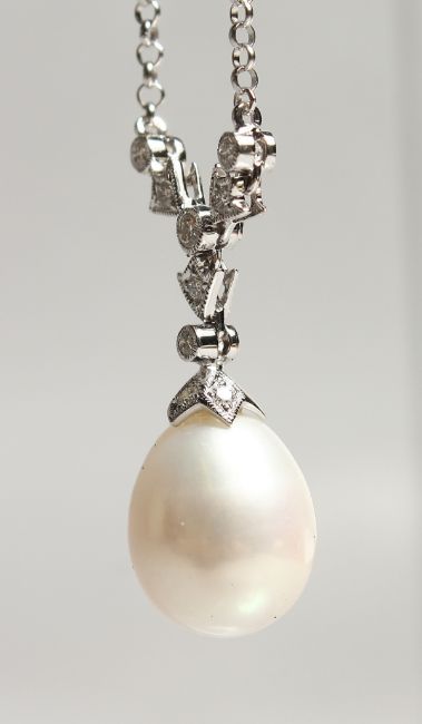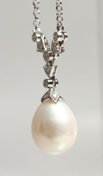 A MATCHING 18CT WHITE GOLD, PEARL AND DIAMOND DROP PENDANT on chain.