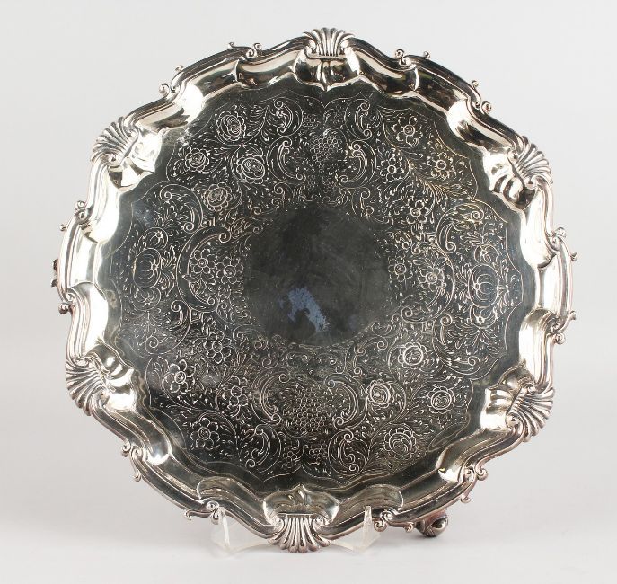 A GEORGE II SILVER PIECRUST SALVER, 13ins diameter, with engraved body, on three knurled feet.