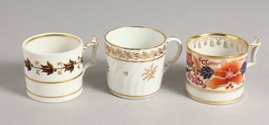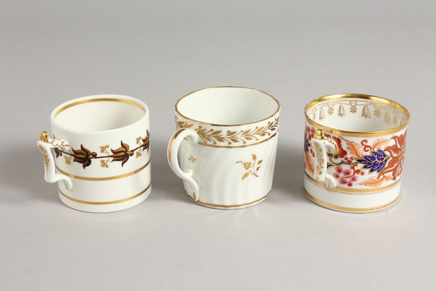 A WORCESTER FLIGHT BARR AND BARR COFFEE CAN painted in Imari style, another FBB can with brown flower and gold leaves and a Chamberlain coffee can with gilded decoration and tramline spiral moulding.