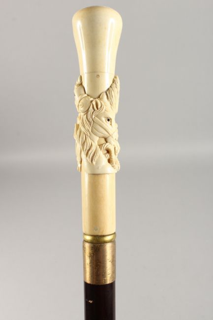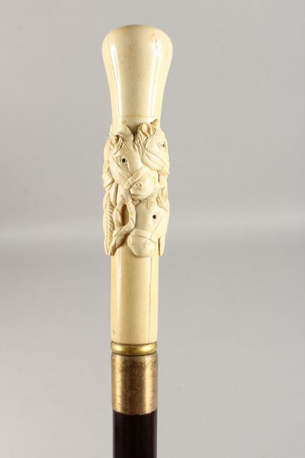 A CARVED BONE HANDLED WALKING CANE, "HORSE'S HEAD".