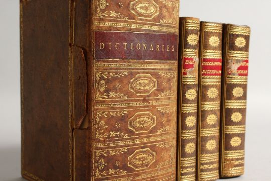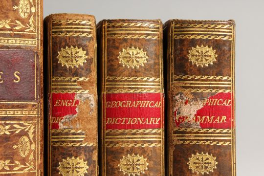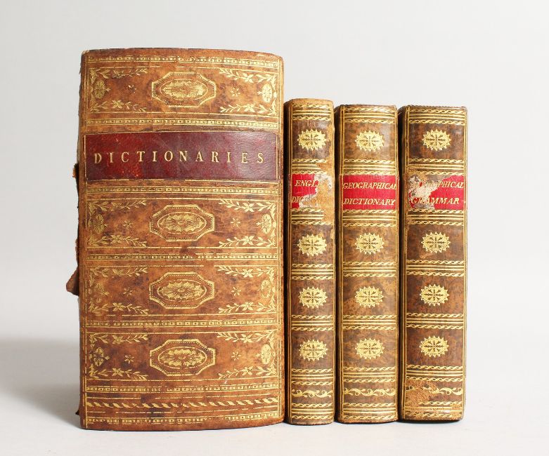 DICTIONARIES: Three small books in a box, ENGLISH DICTIONARY, Fifth Edition MDCCXCVII, GEOGRAPHICAL DICTIONARY, Second Edition, 1795 and GEORGRAPHICAL GRAMMAR, 1795.