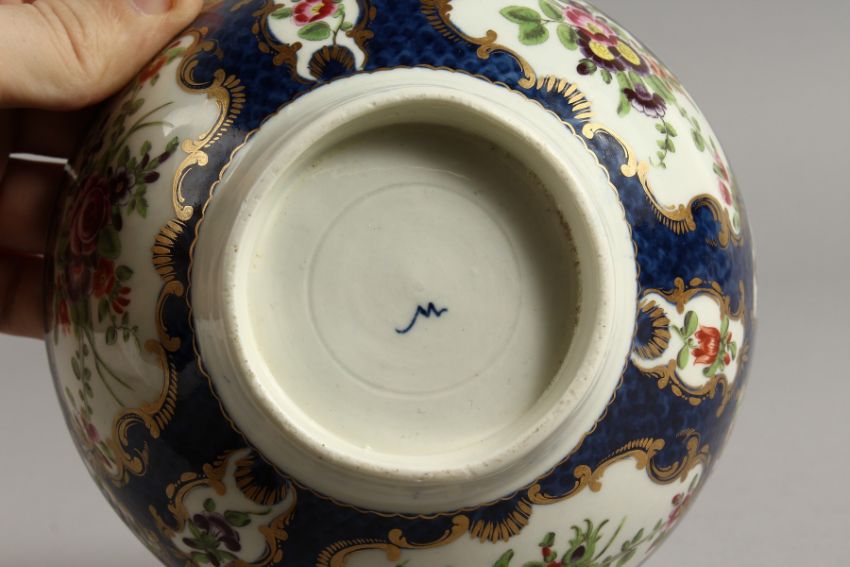 AN 18TH CENTURY WORCESTER BOWL painted with flowers in mirror panel on a blue scale ground.