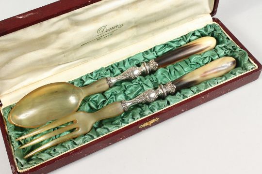 A DOUER ST DIE CASED HORN SALAD SERVERS. Fork and Spoon. Fork 28cm