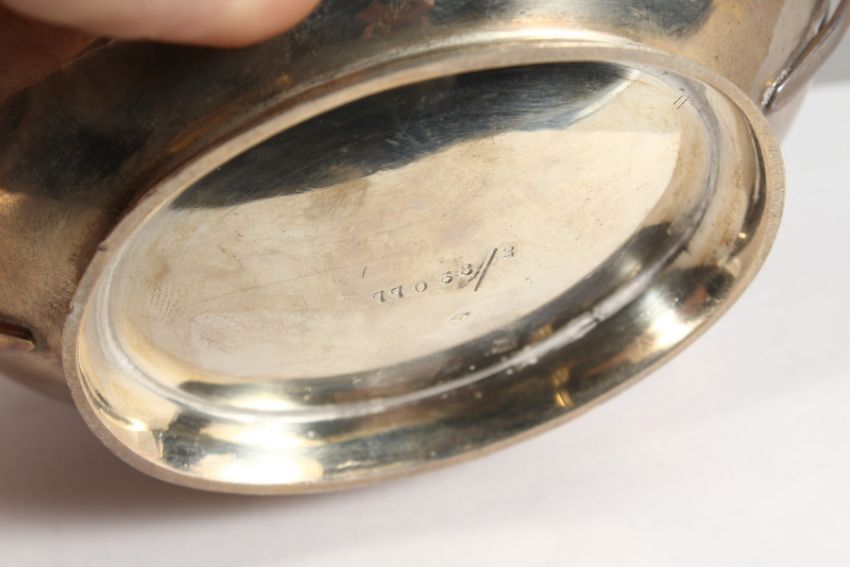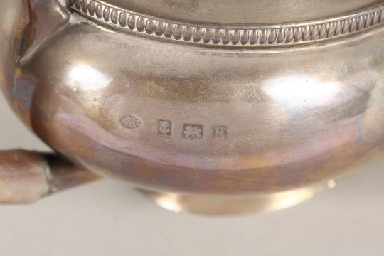 AN OVAL SILVER TEAPOT, SUGAR BASIN AND MILK JUG.