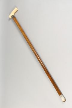 A VICTORIAN IVORY HANDLED WALKING STICK with engraved silver band.