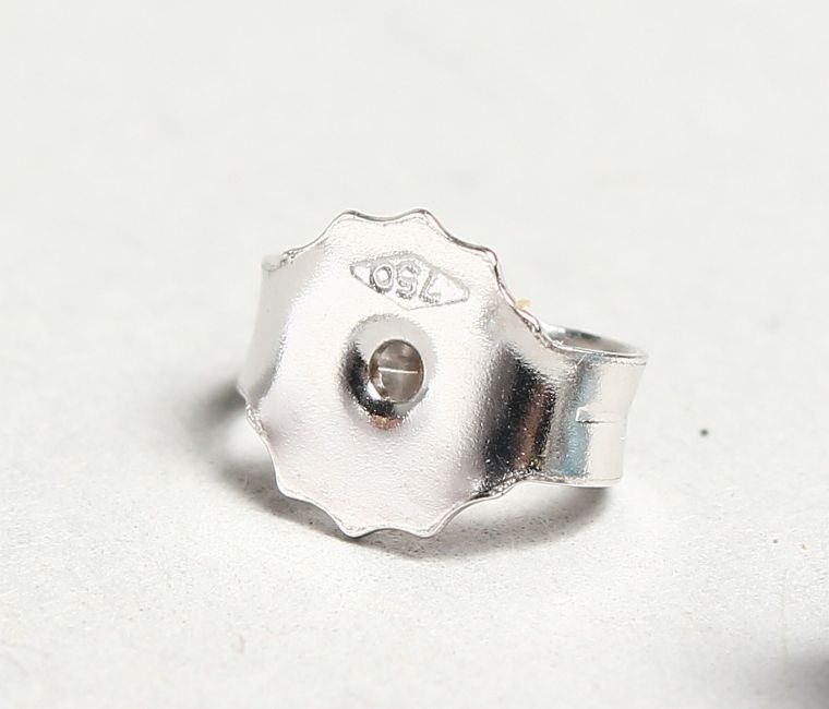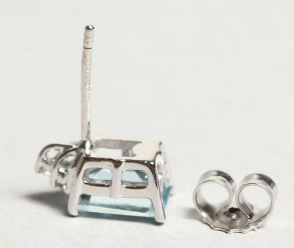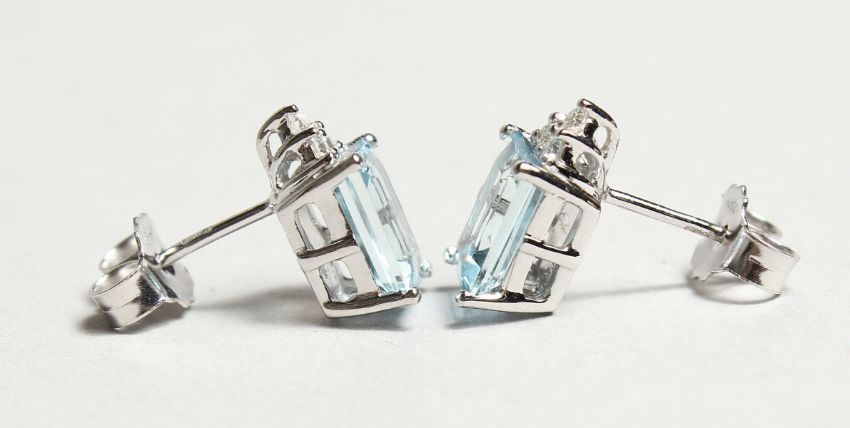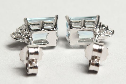 A PAIR OF 18CT WHITE GOLD, AQUAMARINE AND DIAMOND EARRINGS.