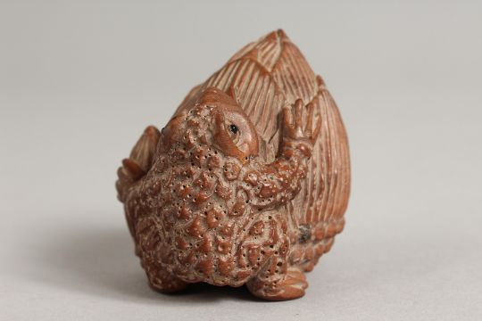 A JAPANESE CARVED WOOD FROG ON A FRUIT.