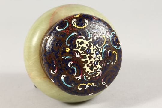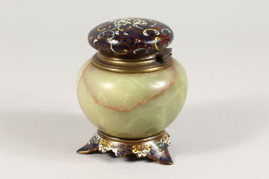 A 19TH CENTURY ONYX AND CLOISONNE ENAMEL INKWELL.