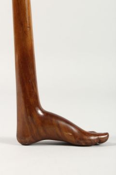 A VERY UNUSUAL CARVED WOOD ONE-PIECE WALKING STICK, the handle as a foot.