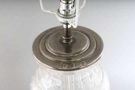 A CUT GLASS LAMP AND SHADE.